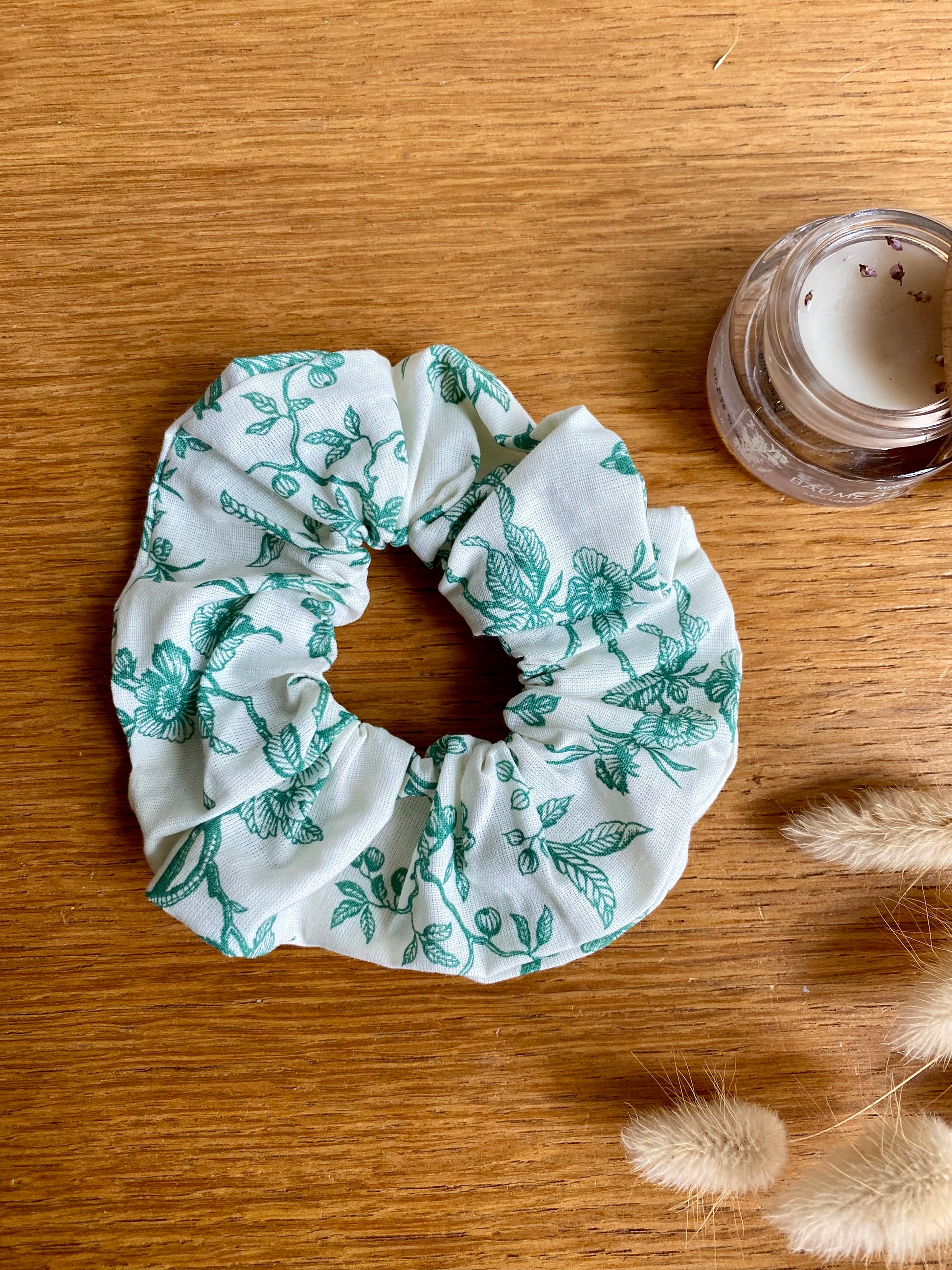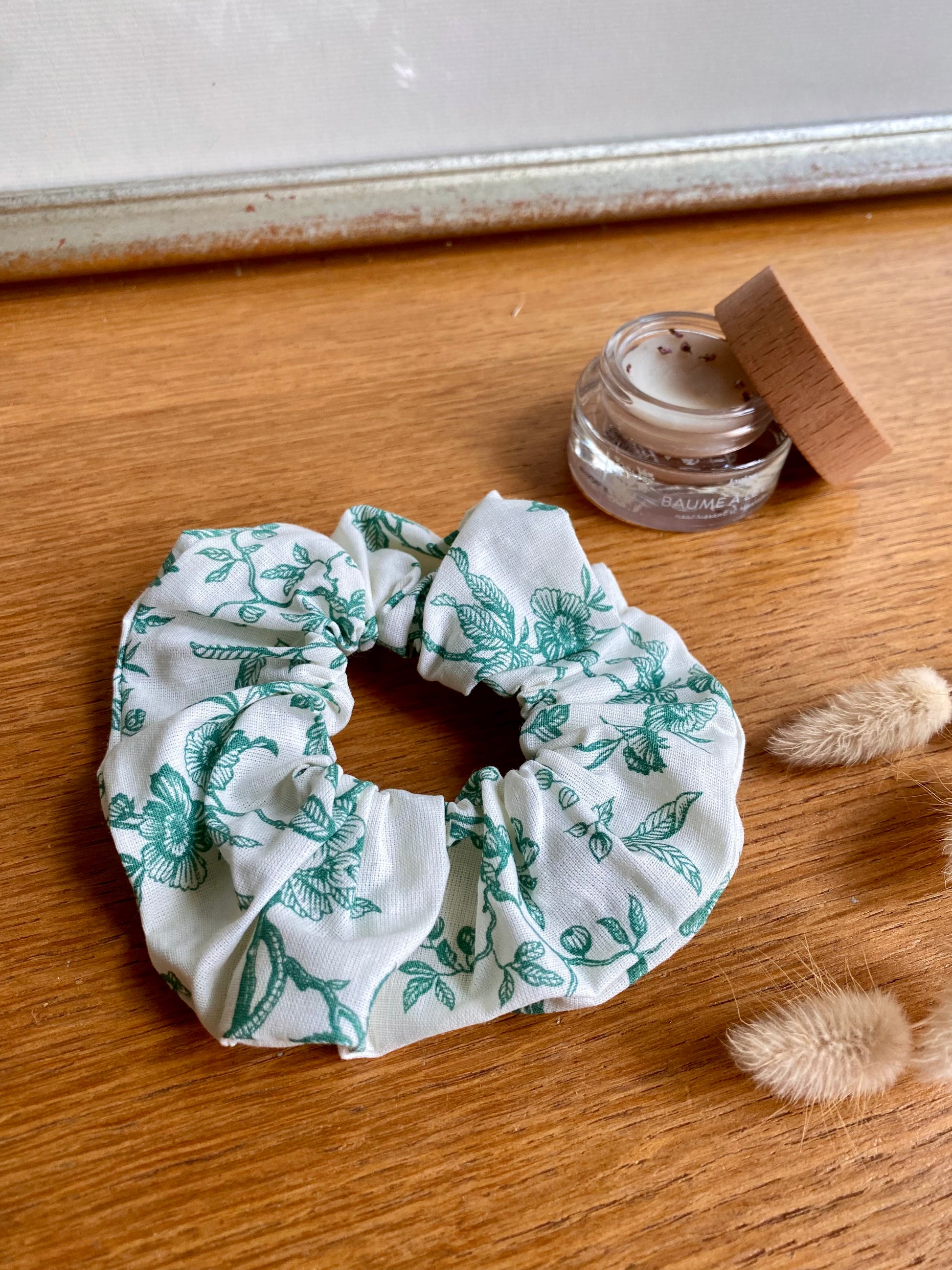 Sublime chouchou en toile de jouy verte « aux mésanges » en coton biologique 🤍