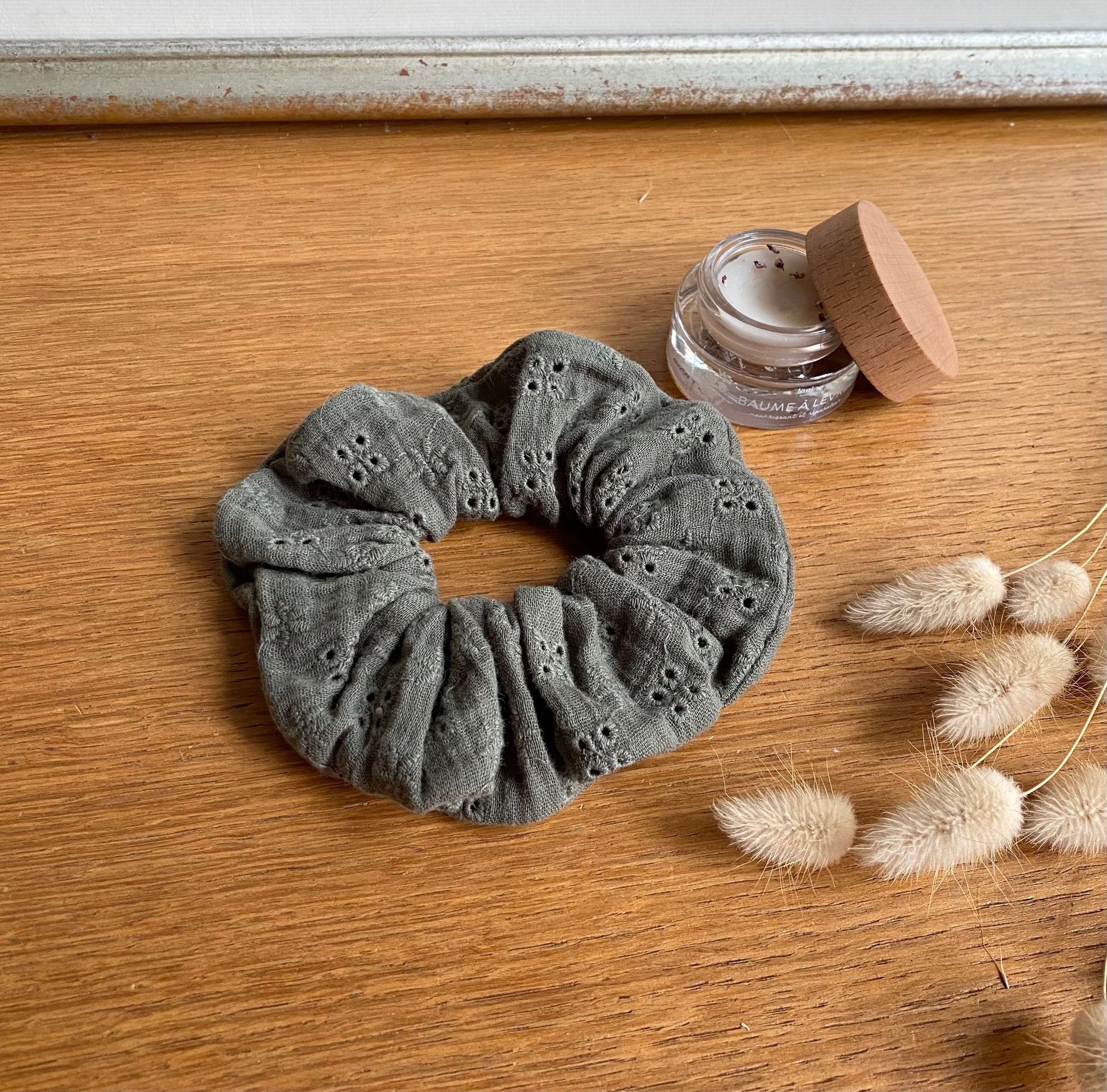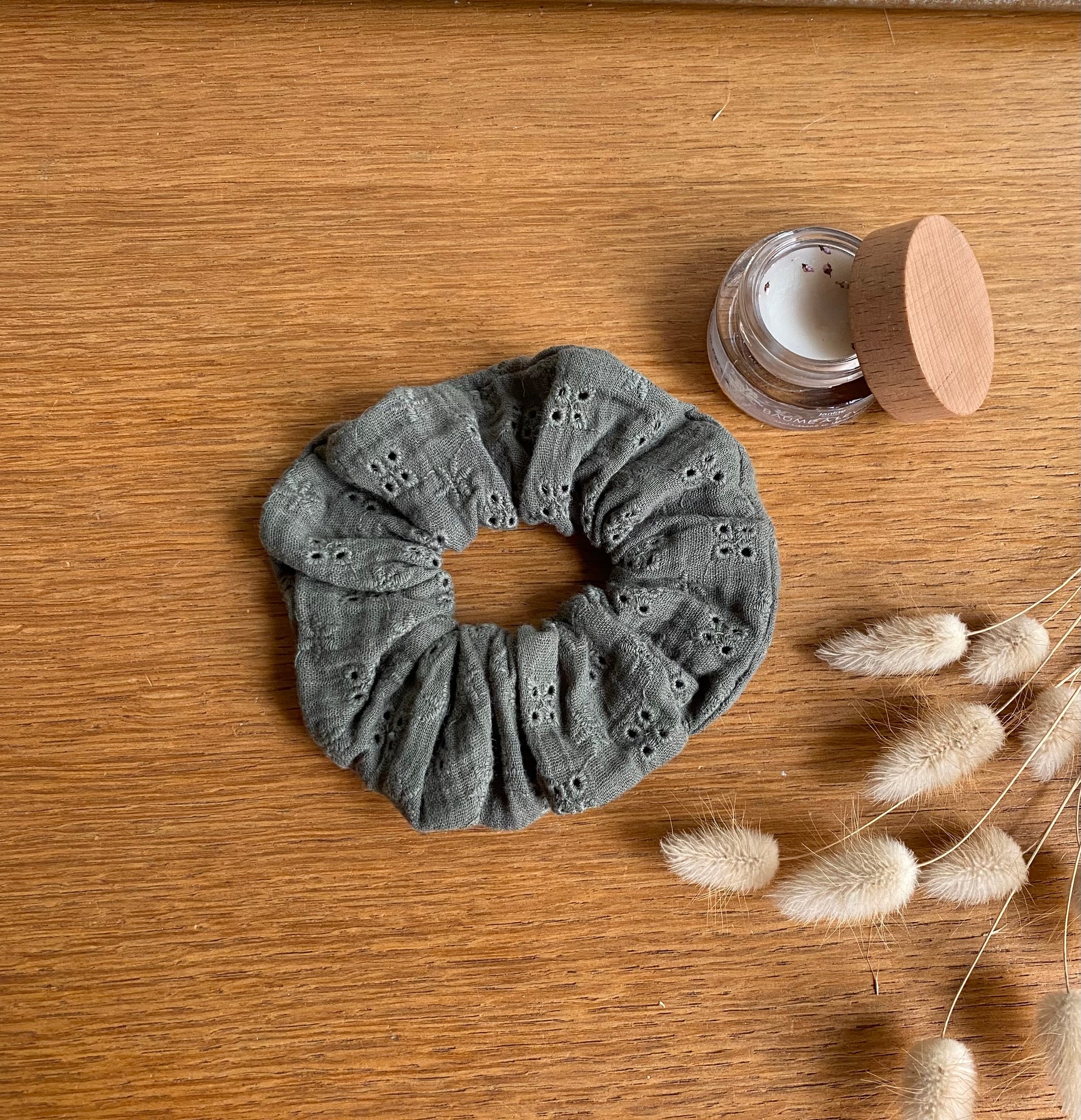 Chouchou en gaze de coton en broderie anglaise kaki biologique đ€