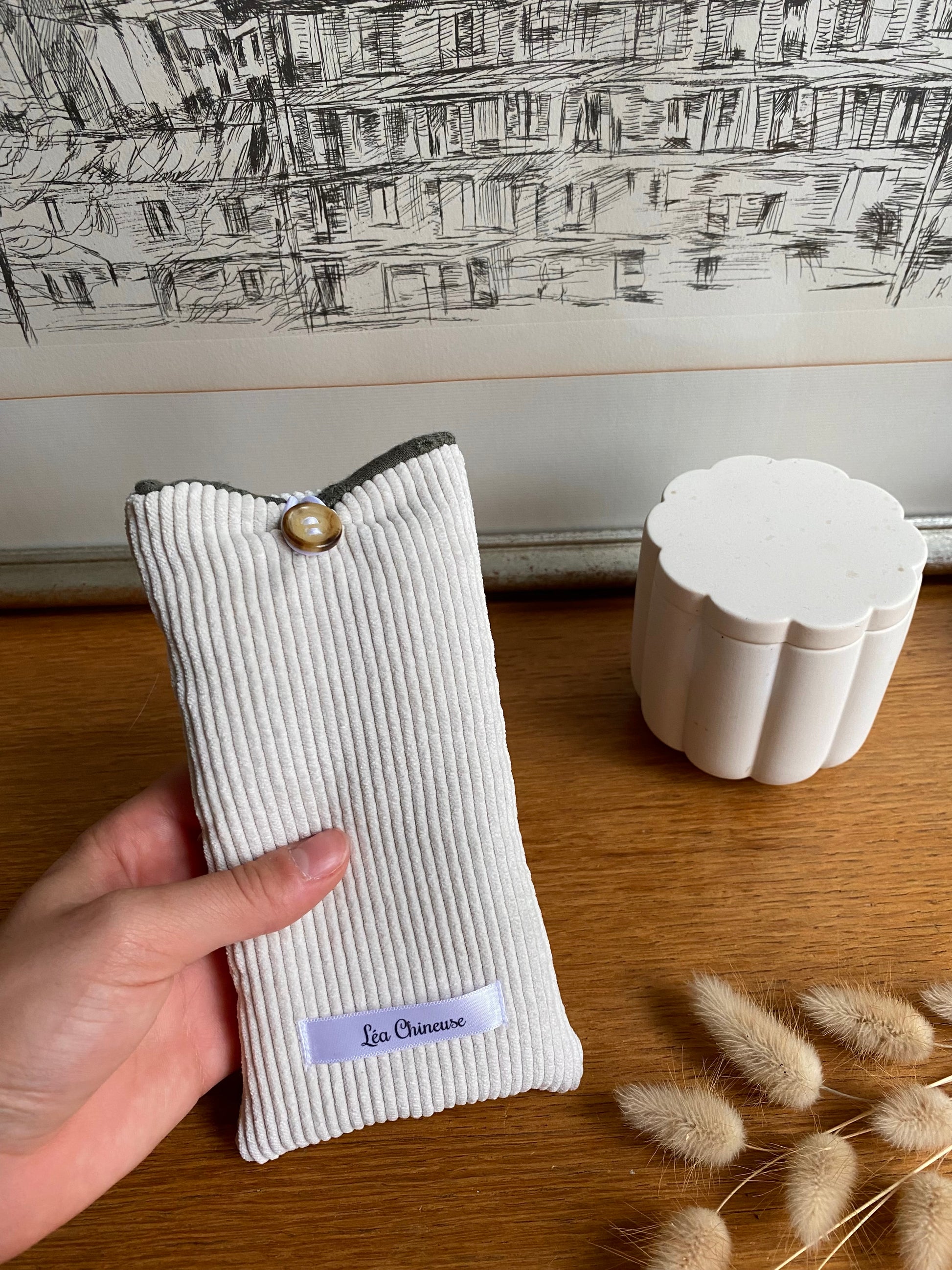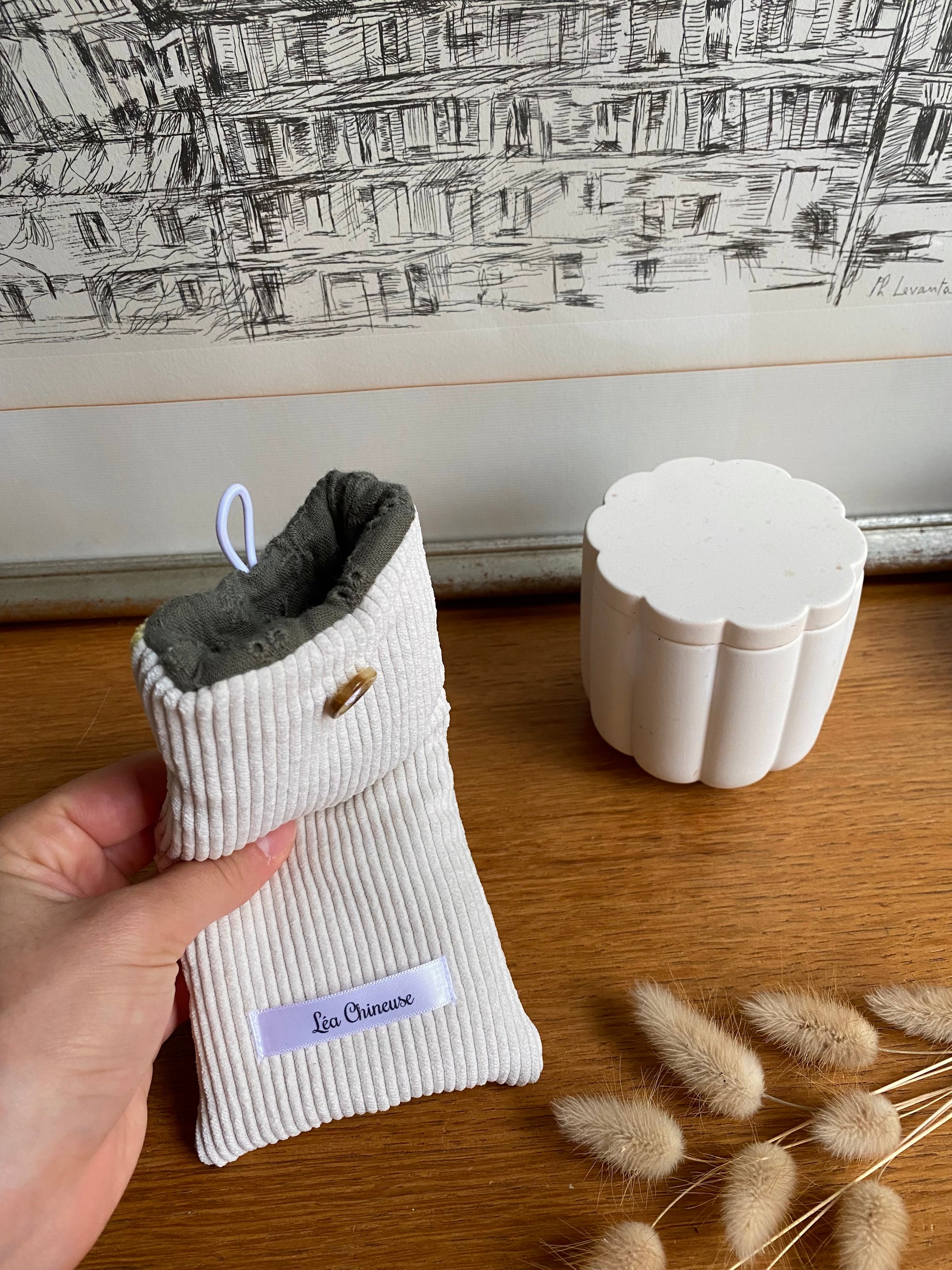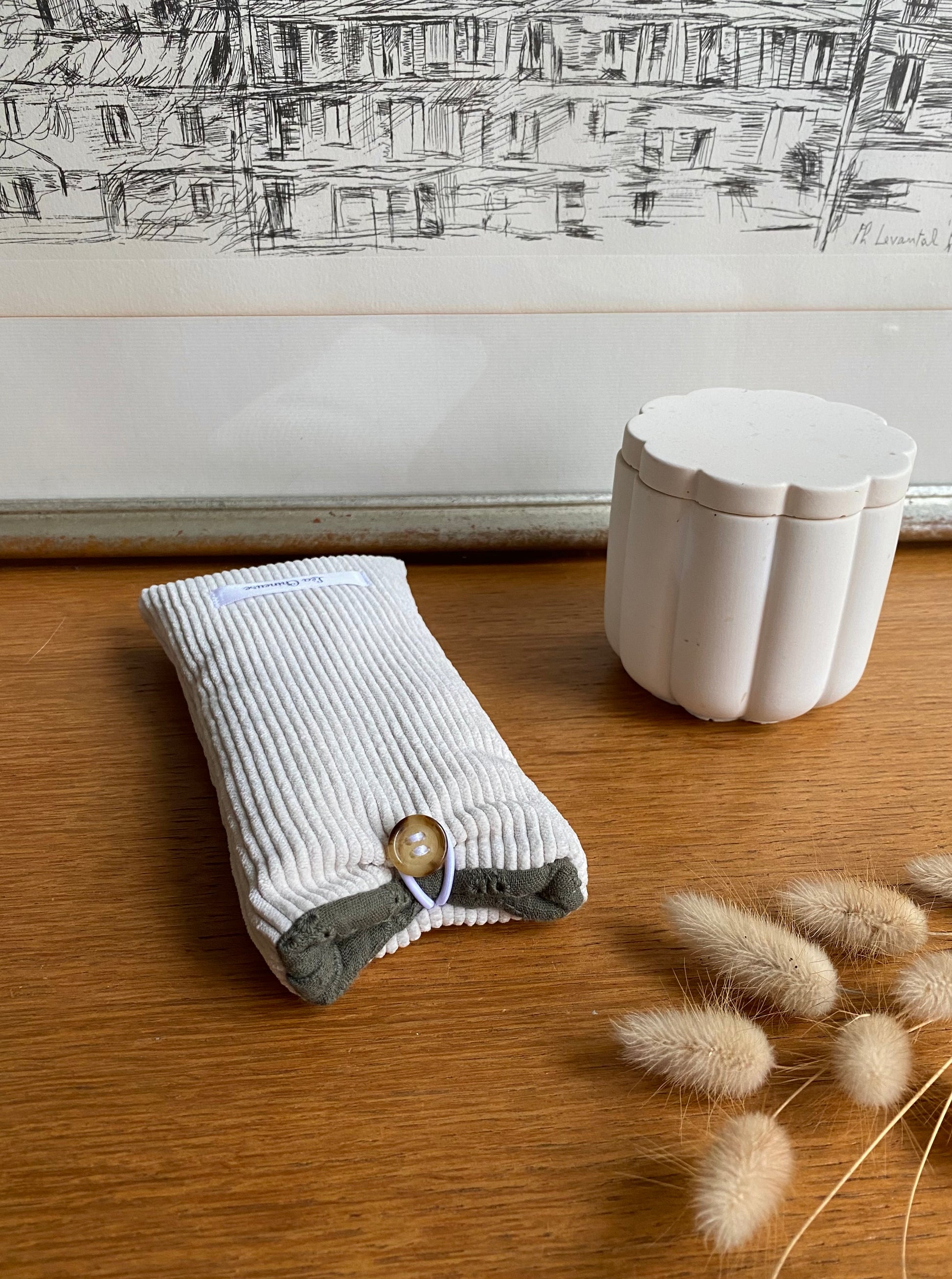 Ce magnifique étui à lunettes est en velours beige écru et broderie anglaise kaki, le tout molletonné des deux côtés afin de protéger vos lunettes🤍