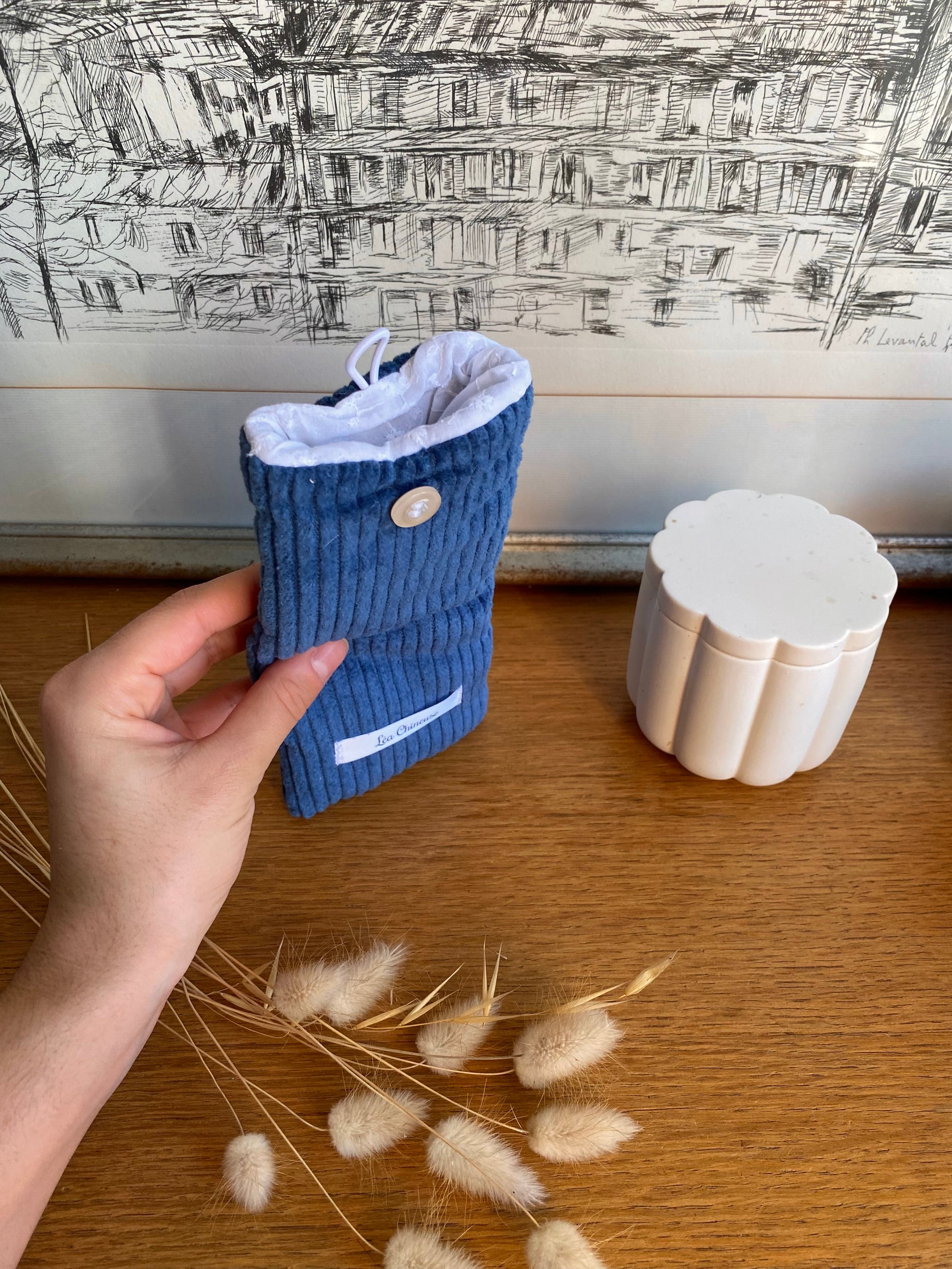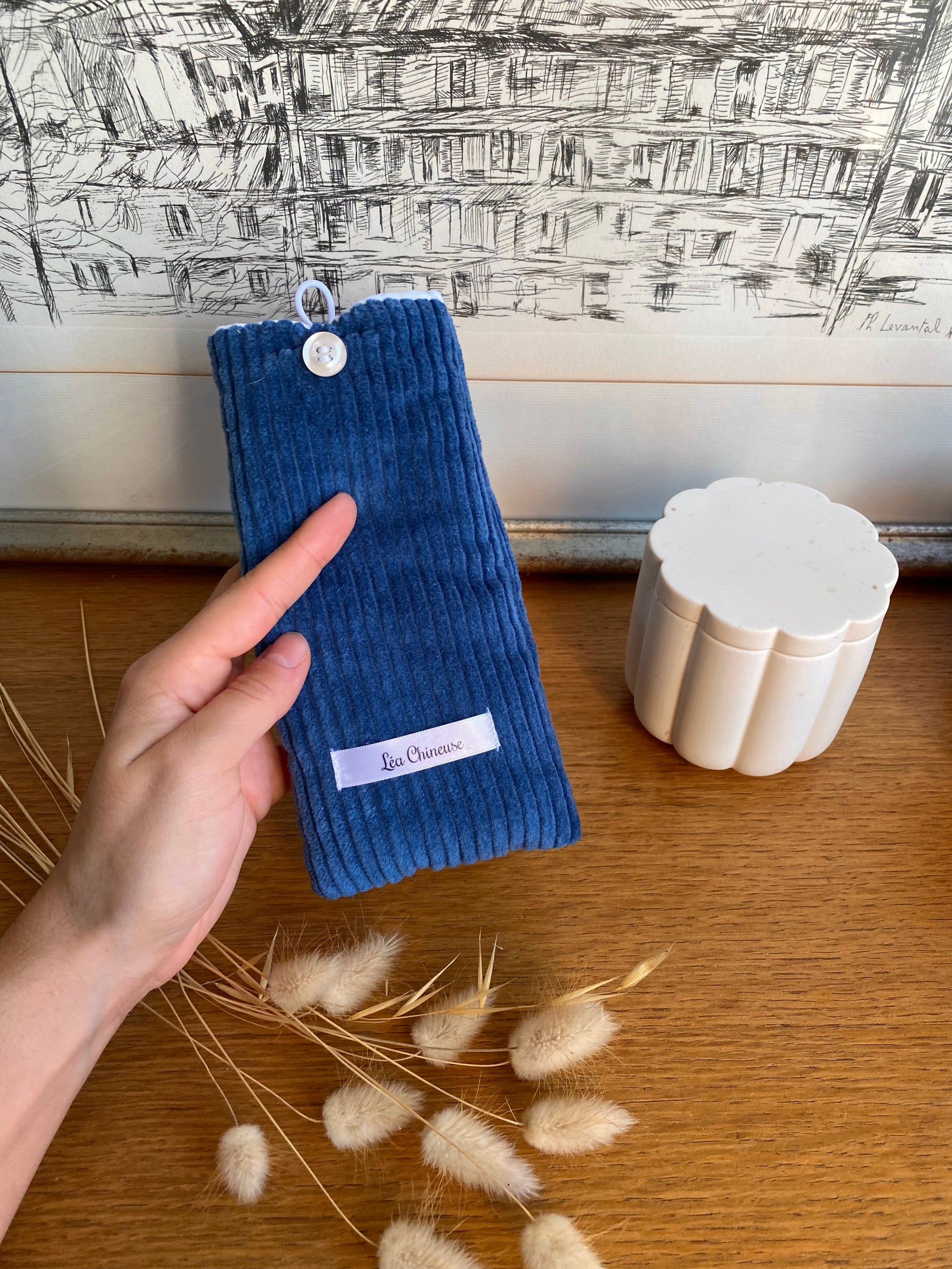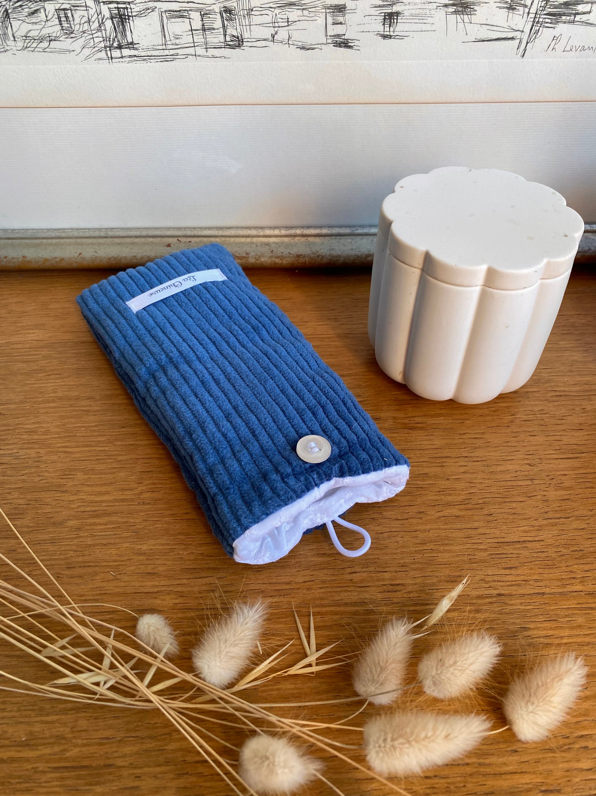 Ce magnifique étui à lunettes est en velours bleu et broderie anglaise blanche, le tout molletonné des deux côtés afin de protéger vos lunettes💙