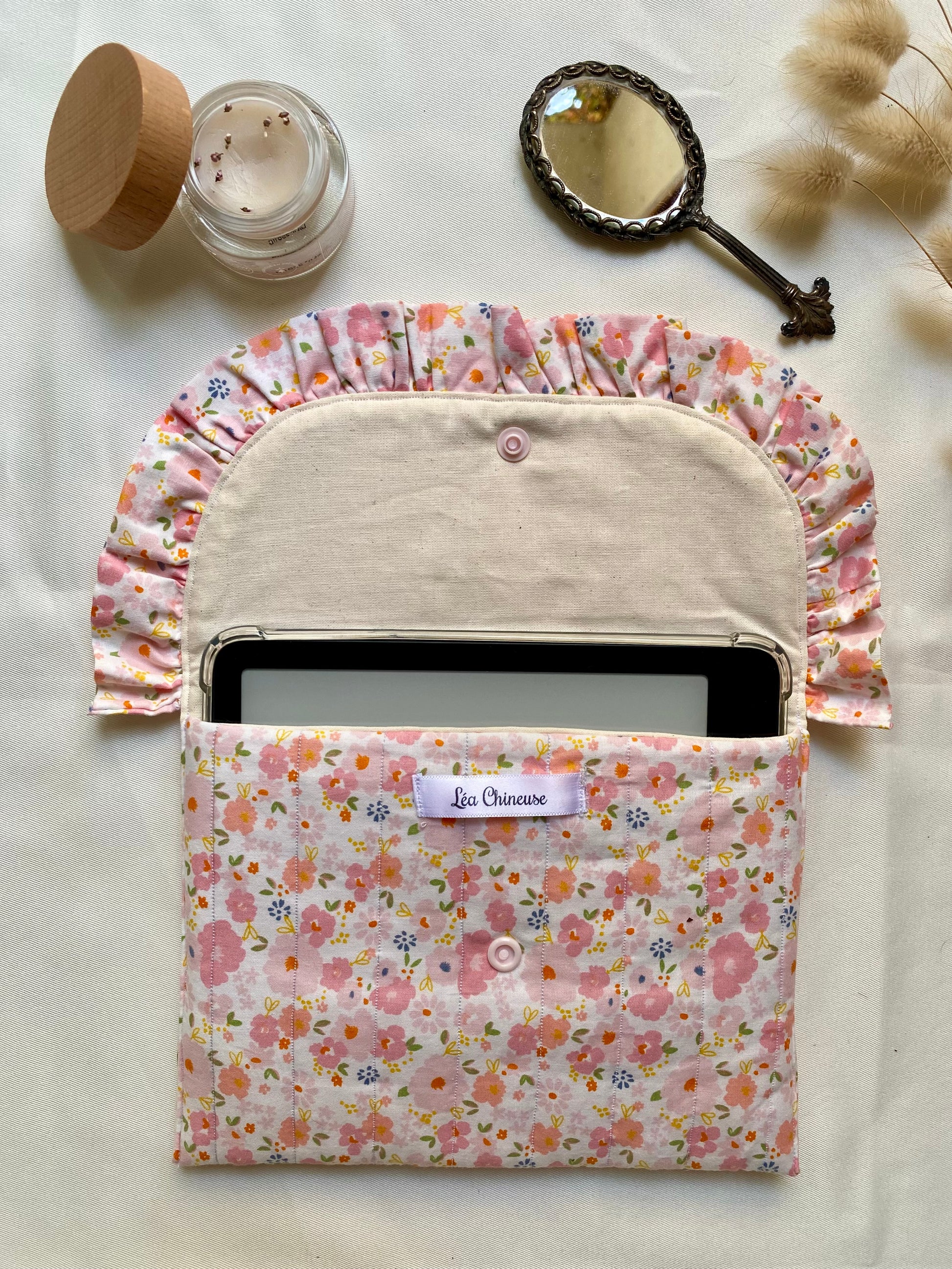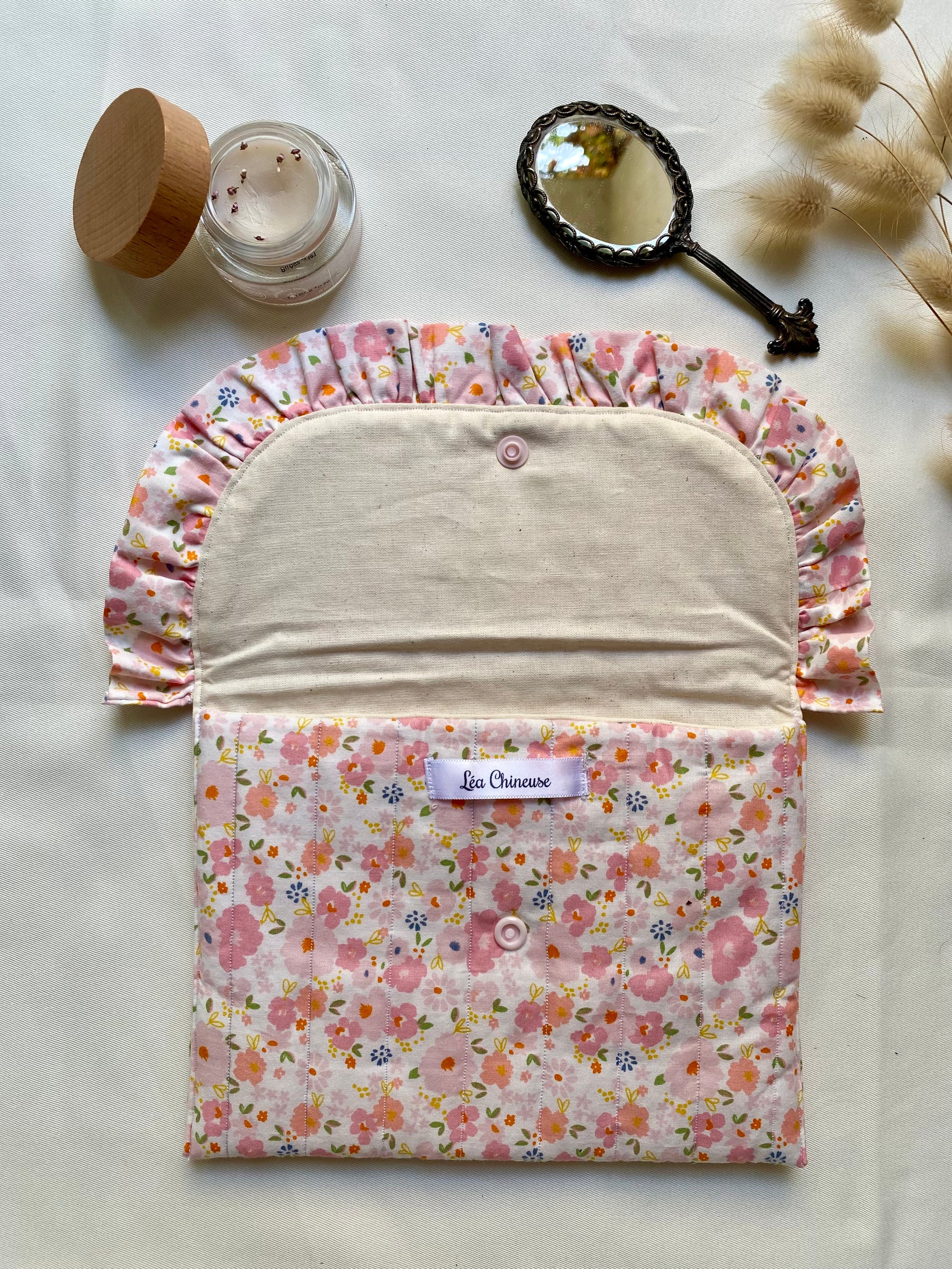 Voici la belle pochette à volant Flora en coton à fleurs rose, et coton beige biologique molletonnée à bouton pression💗