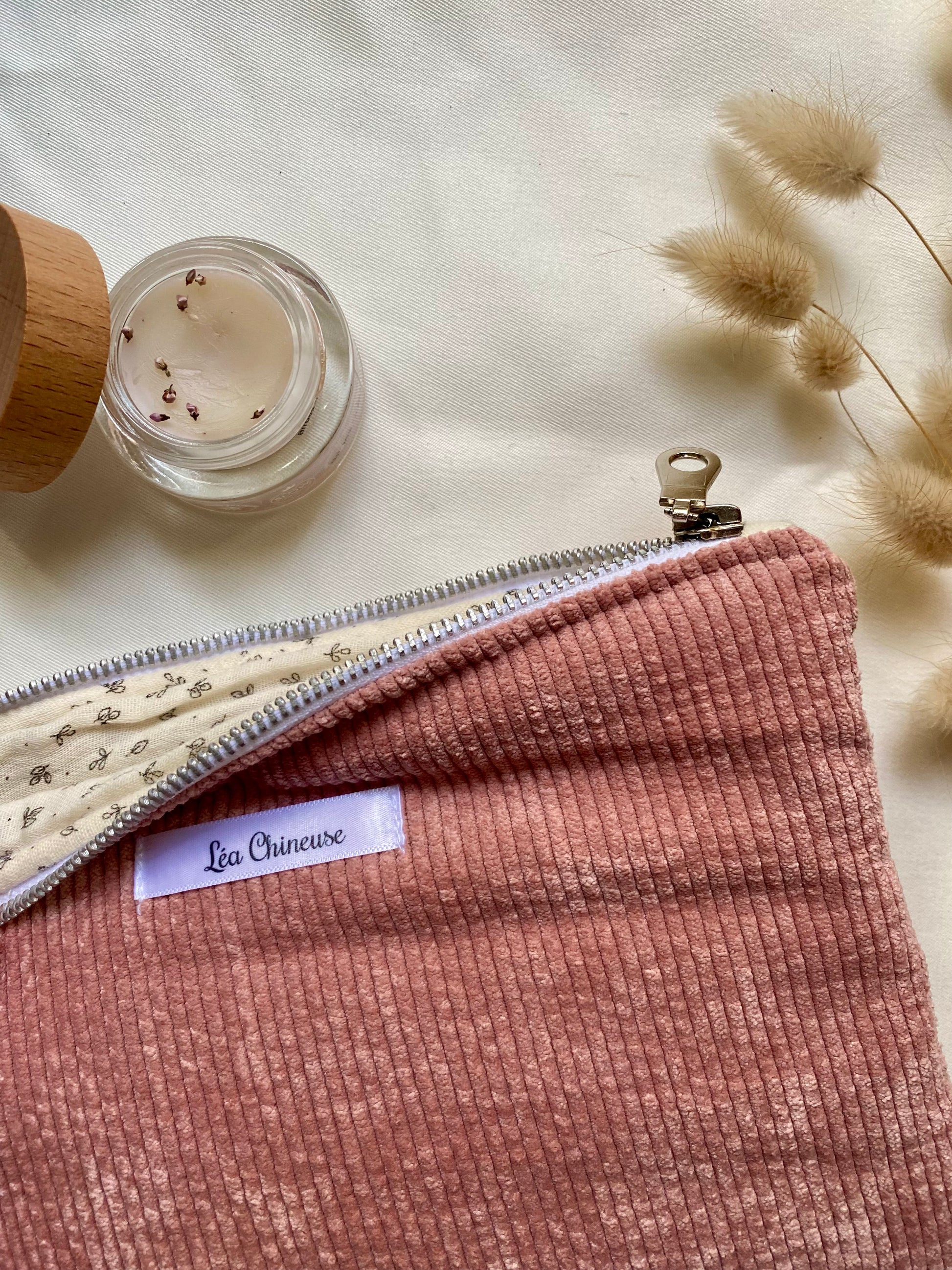 Voici la belle pochette moyenne molletonnée en velours côtelé rose poudré, et popeline de coton beige à feuilles 🍂