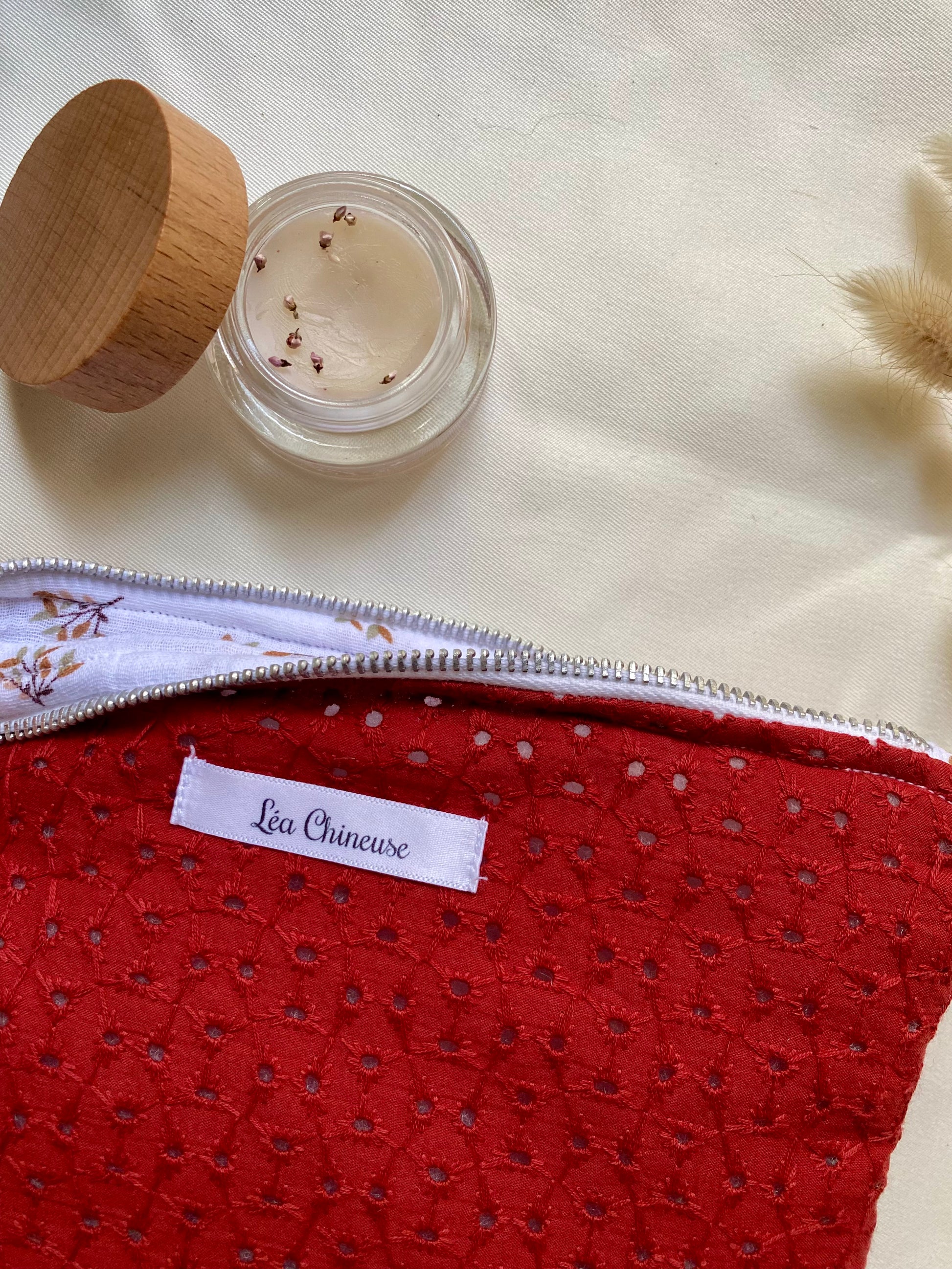 Voici la belle pochette moyenne molletonnée en broderie anglaise rouge, et gaze de coton à feuilles biologique❤️