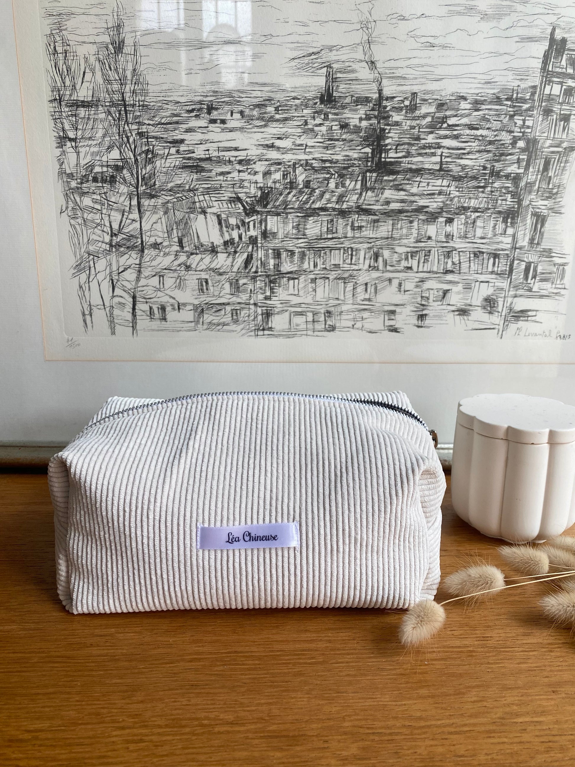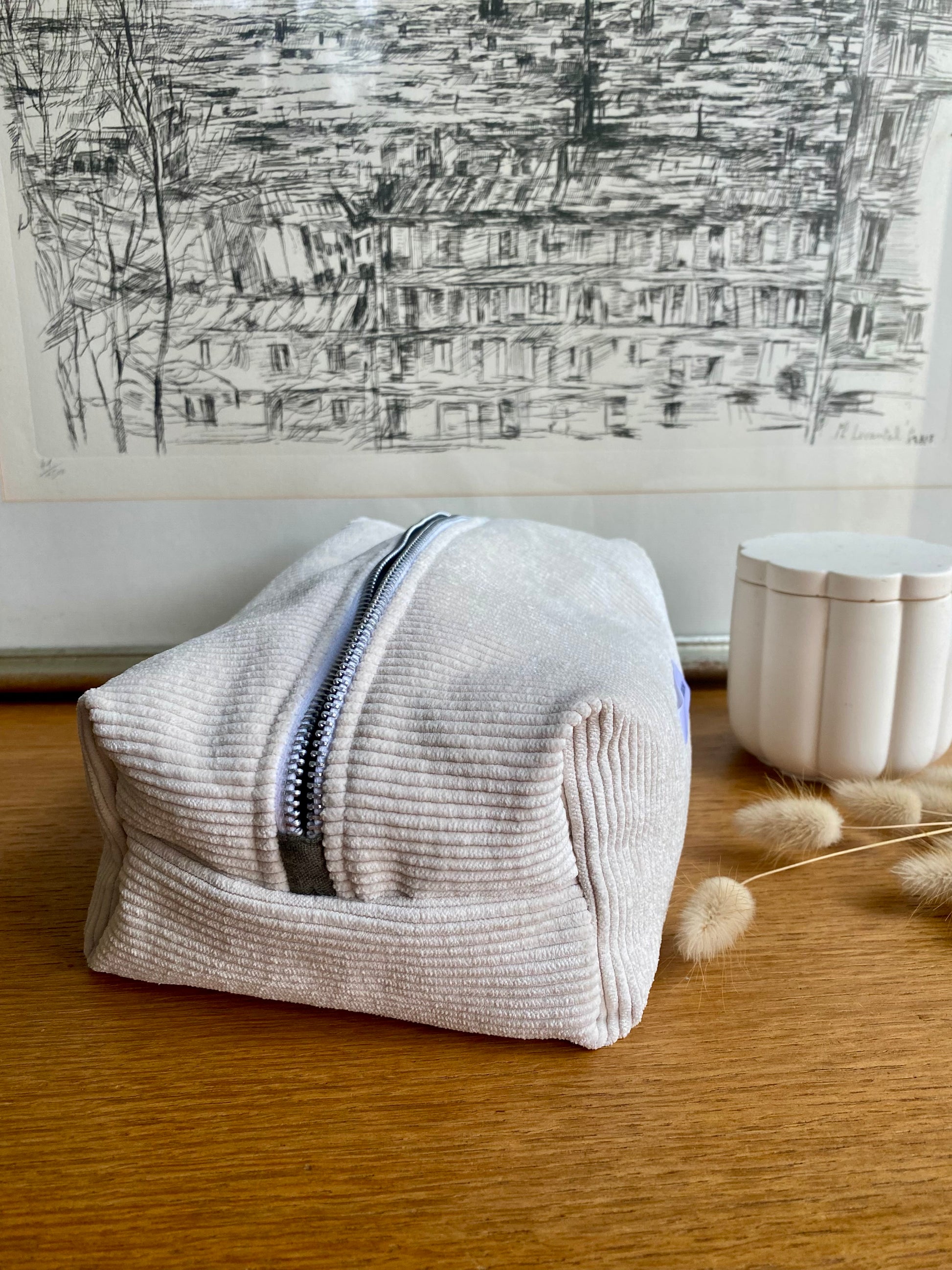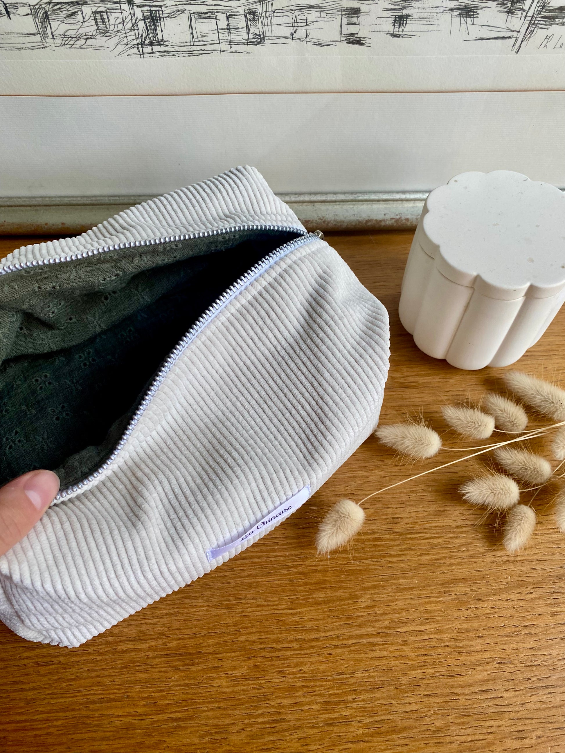 Sublime trousse de toilette en velours côtelé beige et en doublié gaze de coton kaki brodé biologique. Le tout molletonné🤍